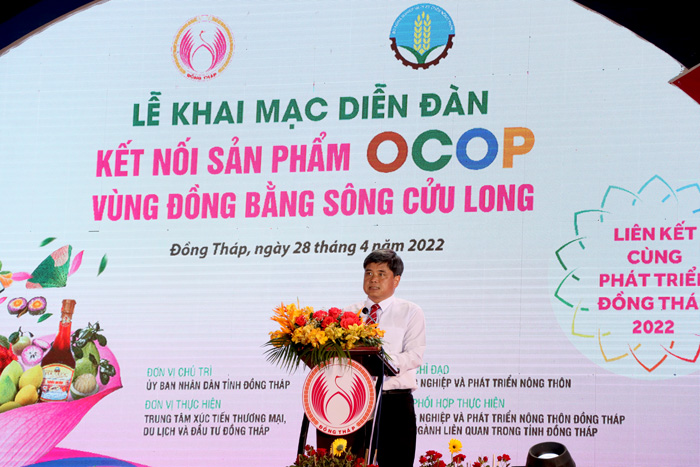 Diễn đàn kết nối sản phẩm OCOP vùng Đồng bằng sông Cửu Long “Liên kết cùng phát triển - Đồng Tháp 2022” khai mạc vào tối 28/4, tại Trung tâm Huấn luyện và Thi đấu Thể dục Thể thao tỉnh Đồng Tháp. Đến dự có Thứ trưởng Bộ Nông nghiệp và Phát triển nông thôn Trần Thanh Nam, đại diện Cục Xúc tiến thương mại (Bộ Công Thương) và lãnh đạo một số tỉnh, thành phố.