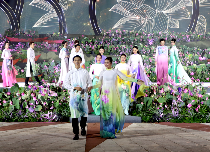 Một trong những điểm nhấn của chương trình nghệ thuật còn có trình diễn áo dài, với bộ sưu tập áo dài “Lụa hát sen trong – Sen vươn ra thế giới” của nghệ nhân vẽ áo dài – nhà thiết kế Trung Đinh.