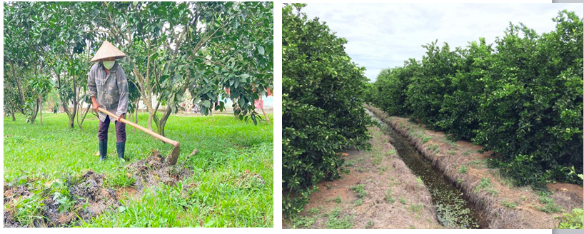 Tiến hành đào rãnh thoát nước tại mương, liếp để hạ nhanh mực thủy cấp, tạo điều kiện cho rễ cây được thông thoáng, hỗ trợ quá trình phục hồi. Xới nhẹ lớp đất mặt xung quanh gốc cây bằng cuốc, cào răng cưa để phá sự đóng váng bề mặt, hỗ trợ thoáng khí vùng phía trên và xung quanh rễ.