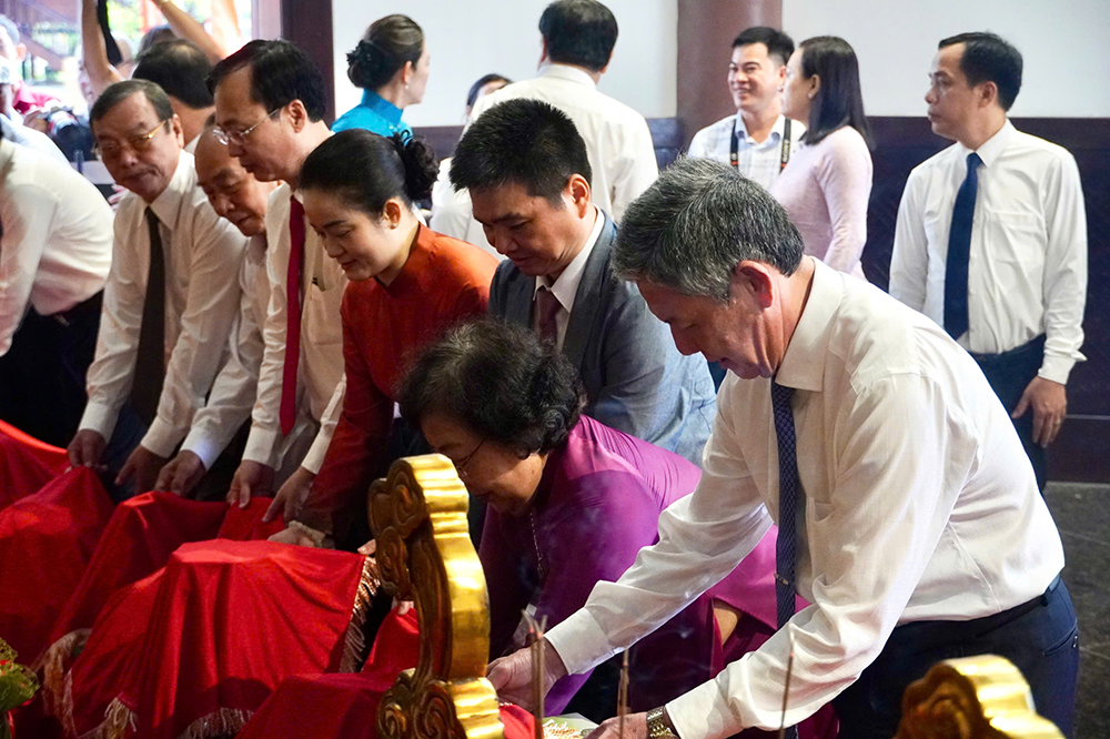 Lãnh đạo tỉnh Đồng Tháp dâng vật phẩm trước bàn thờ Cụ Phó bảng Nguyễn Sinh Sắc