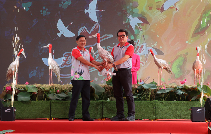 Ông Thanachon Kensingh - Giám đốc vườn thú Nakhon Ratchasima (bìa phải) trao mô hình Sếu đầu đỏ cho ông Nguyễn Văn Lâm - Giám đốc Vườn Quốc gia Tràm Chim