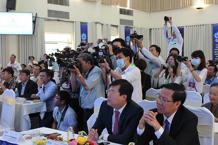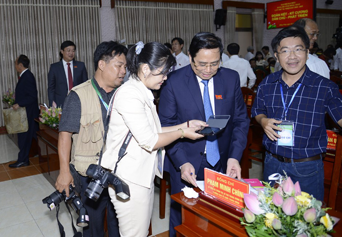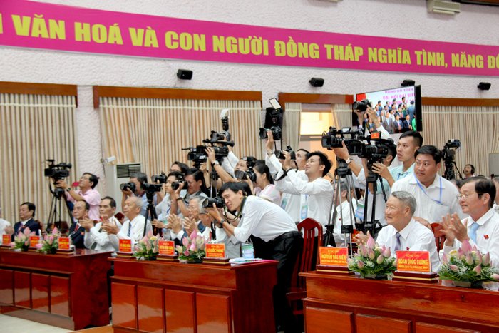 Phóng viên Cổng Thông tin điện tử Đồng Tháp tác nghiệp tại Đại hội Đảng bộ tỉnh lần thứ XI