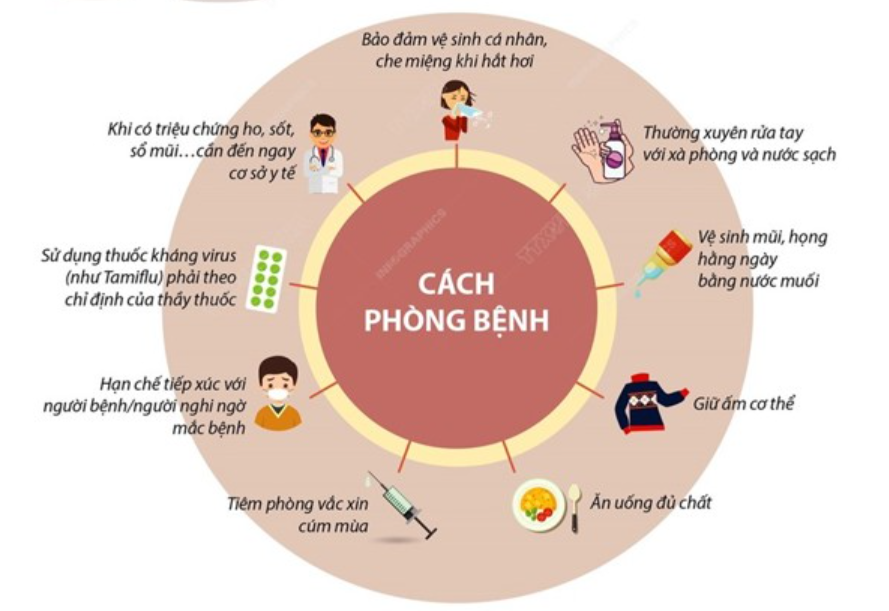 Theo Khuyến cáo thực hiện các biện pháp phòng, chống cúm mùa của Cục Y tế dự phòng (Bộ Y tế) cần: Đảm bảo vệ sinh cá nhân, che miệng khi hắt hơi; thường xuyên rửa tay với xà phòng với nước sạch; vệ sinh mũi, họng hàng ngày bằng nước muối. Giữ ấm cơ thể, ăn uống đủ chất để nâng cao thể trạng. Tiêm vắc xin cúm mùa, đây là biện pháp dự phòng hiệu quả nhất. Hạn chế tiếp xúc với bệnh nhân cúm hoặc các trường hợp nghi ngờ mắc bệnh khi không cần thiết. Khi có triệu chứng ho, sốt, sổ mũi, đau đầu, mệt mỏi cần đến ngay cơ sở y tế để được khám, xử trí kịp thời.