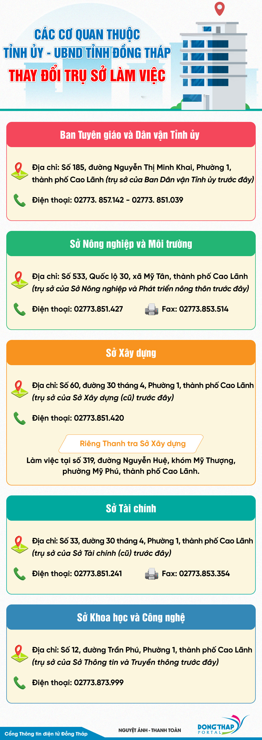 Theo thông báo của các cơ quan, đơn vị đến ngày 12/3/2025, Cổng Thông tin điện tử Đồng Tháp đã tổng hợp địa chỉ trụ sở, số điện thoại liên hệ mới của các cơ quan vừa được thành lập: Ban Tuyên giáo và Dân vận Tỉnh ủy, Sở Nông nghiệp và Môi trường, Sở Xây dựng, Sở Tài chính, Sở Khoa học và Công nghệ. Thông tin sẽ tiếp tục cập nhật khi có thông báo mới.