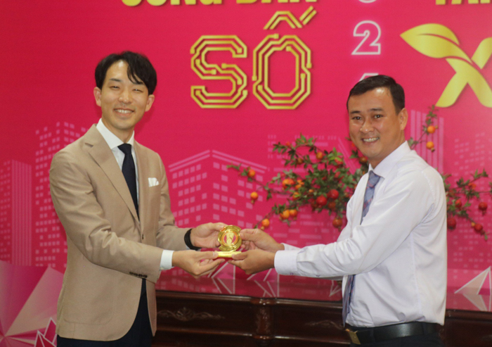 Ông Nguyễn Phi Đa (bên phải) trao tặng biểu trưng của tỉnh Đồng Tháp cho ông Masayuki Isohata