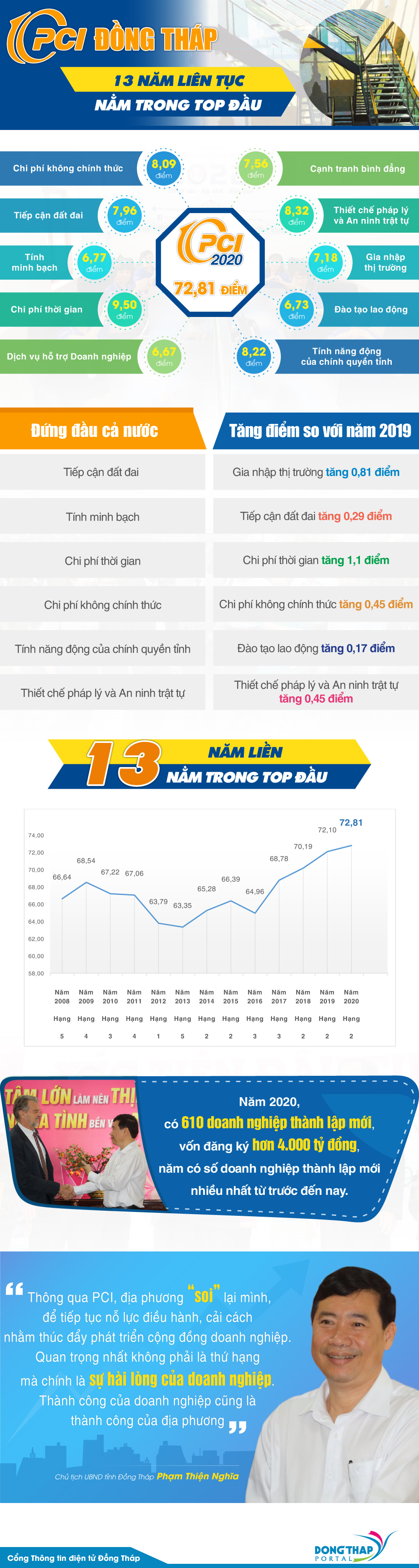 Năm 2020, Đồng Tháp tiếp tục gây ấn tượng với Chỉ số năng lực cạnh tranh cấp tỉnh (PCI) đứng thứ 2 cả nước (72,81 điểm, tăng 0,71 điểm so với năm 2019). Kết quả này nối dài những thành tích của Đồng Tháp khi 13 năm liền nằm trong top đầu cả nước. Mời xem infographic sau đây.