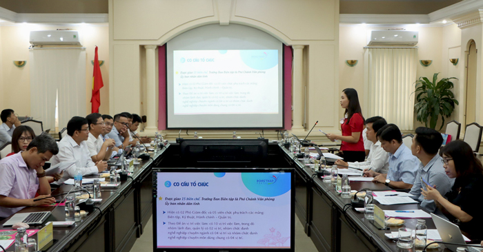 Bà Lê Thị Như Ý – Phó Giám đốc phụ trách điều hành Cổng Thông tin điện tử Đồng Tháp chia sẻ về hoạt động của đơn vị đến đoàn công tác