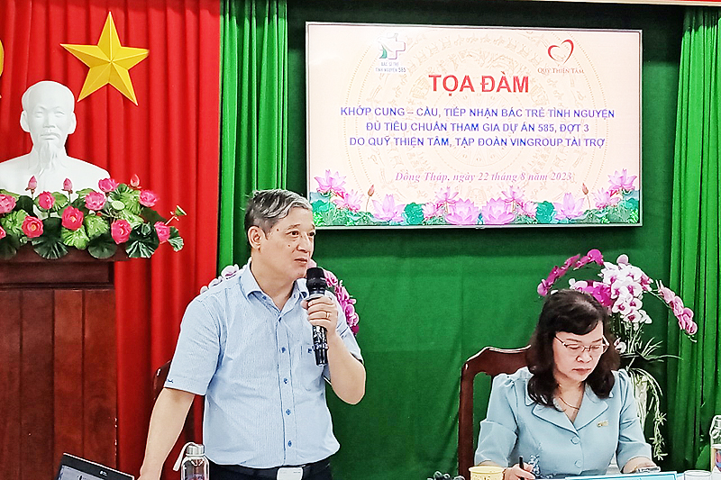 Chiều ngày 22/8/2023, tại Sở Y tế Đồng Tháp, Cục Khoa học công nghệ và Đào tạo - Bộ Y tế, Ban Quản lý Dự án 585 phối hợp với Sở Y tế Đồng Tháp tổ chức buổi Tọa đàm, phỏng vấn các bác sĩ đủ điều kiện tham gia Dự án 585 đợt 3 do Quỹ Thiện Tâm, Tập đoàn Vingroup tài trợ các tỉnh Đồng Tháp, An Giang và Long An.