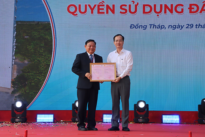 Chủ tịch Ủy ban nhân dân tỉnh Trần Trí Quang trao Giấy Chứng nhận quyền sử dụng đất cho lãnh đạo Trường Đại học Đồng Tháp