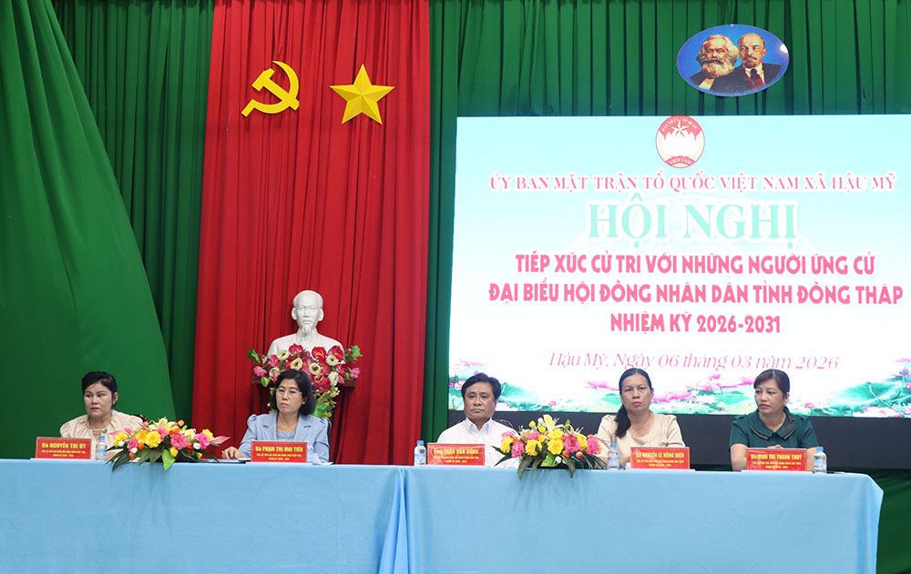 Tiếp tục chương trình vận động tiếp xúc cử tri tại xã Hậu Mỹ, chiều ngày 06/3, Ủy ban Mặt trận Tổ quốc Việt Nam tỉnh Đồng Tháp tổ chức Hội nghị tiếp xúc cử tri với những người ứng cử đại biểu Hội đồng nhân dân tỉnh, nhiệm kỳ 2026 - 2031 thuộc đơn vị bầu cử số 17.