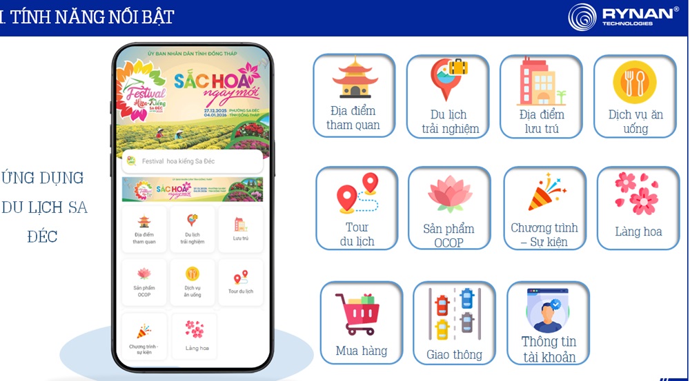 Với các tính năng nổi bật như: giới thiệu địa điểm tham quan, du lịch trải nghiệm, cơ sở lưu trú, dịch vụ ăn uống, tour du lịch, sản phẩm OCOP; cập nhật chương trình - sự kiện, thông tin làng hoa Sa Đéc; chức năng mua hàng, theo dõi tình trạng giao thông và quản lý tài khoản người dùng.
