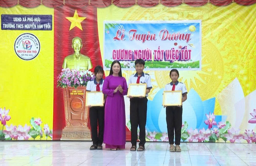 Ngày 29/12, Trường Trung học cơ sở Nguyễn Văn Trỗi (xã Phú Hựu) tổ chức Lễ tuyên dương gương “Người tốt, việc tốt” cho 03 học sinh có hành động nhặt được của rơi, trả lại người đánh mất. Bà Võ Thị Bình – Chủ tịch Ủy ban nhân dân xã Phú Hựu đến dự và trao khen thưởng cho các em học sinh.