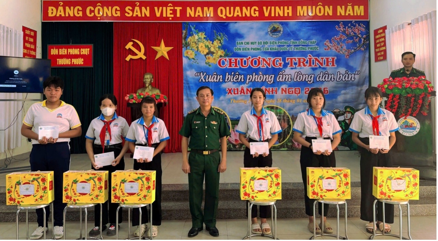 Tại Chương trình “Xuân Biên phòng, ấm lòng dân bản”, Đồn Biên phòng Cửa khẩu quốc tế Thường Phước trao tặng 150 suất quà tết (500.000 đồng/suất) cho gia đình chính sách, hộ nghèo, hộ khó khăn và học sinh.