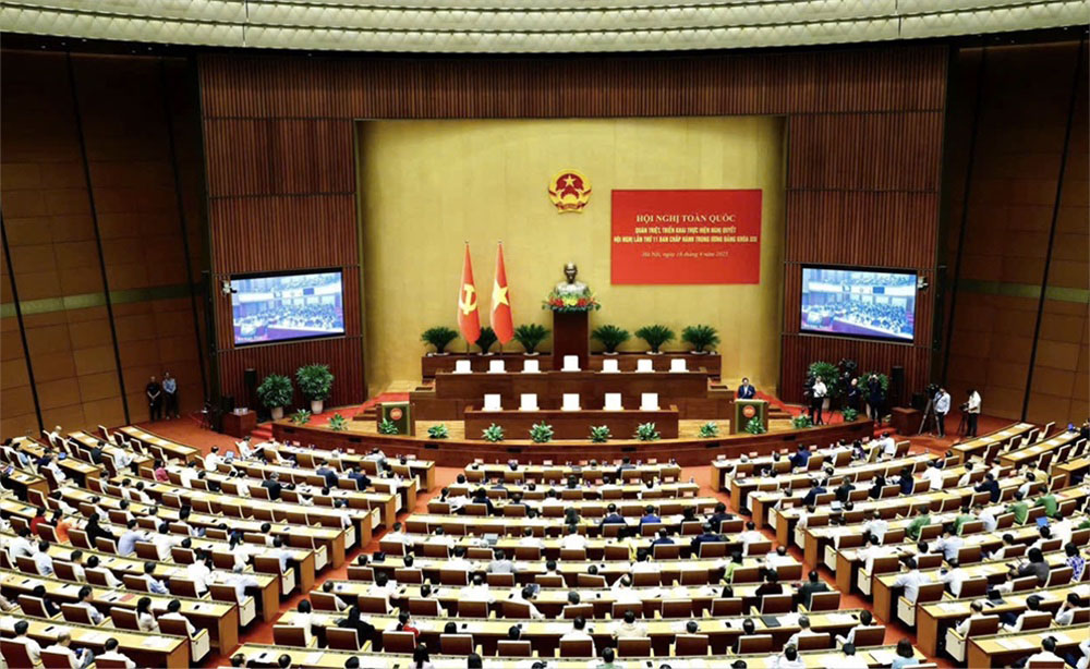 Hội nghị toàn quốc nghiên cứu, học tập, quán triệt và triển khai thực hiện Nghị quyết Đại hội XIV của Đảng tại điểm cầu chính Hội trường Diên Hồng, Nhà Quốc hội. Ảnh: chinhphu.vn