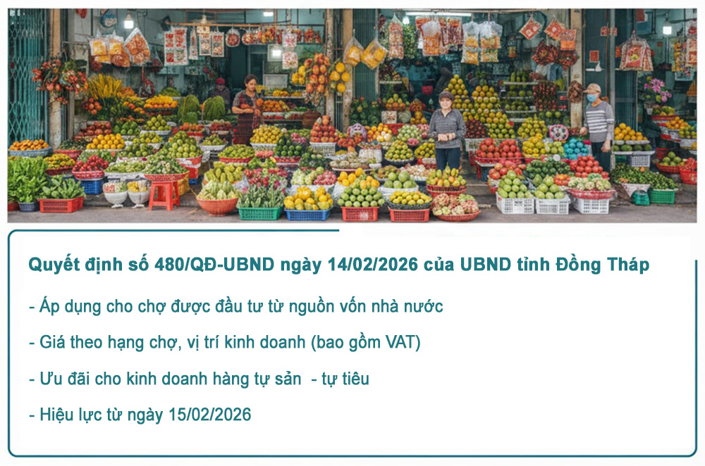 Ủy ban nhân dân tỉnh Đồng Tháp vừa ban hành Quyết định số 480/QĐ-UBND ngày 14/02/2026 về việc quy định giá dịch vụ sử dụng diện tích bán hàng tại chợ được đầu tư từ nguồn vốn nhà nước trên địa bàn tỉnh.