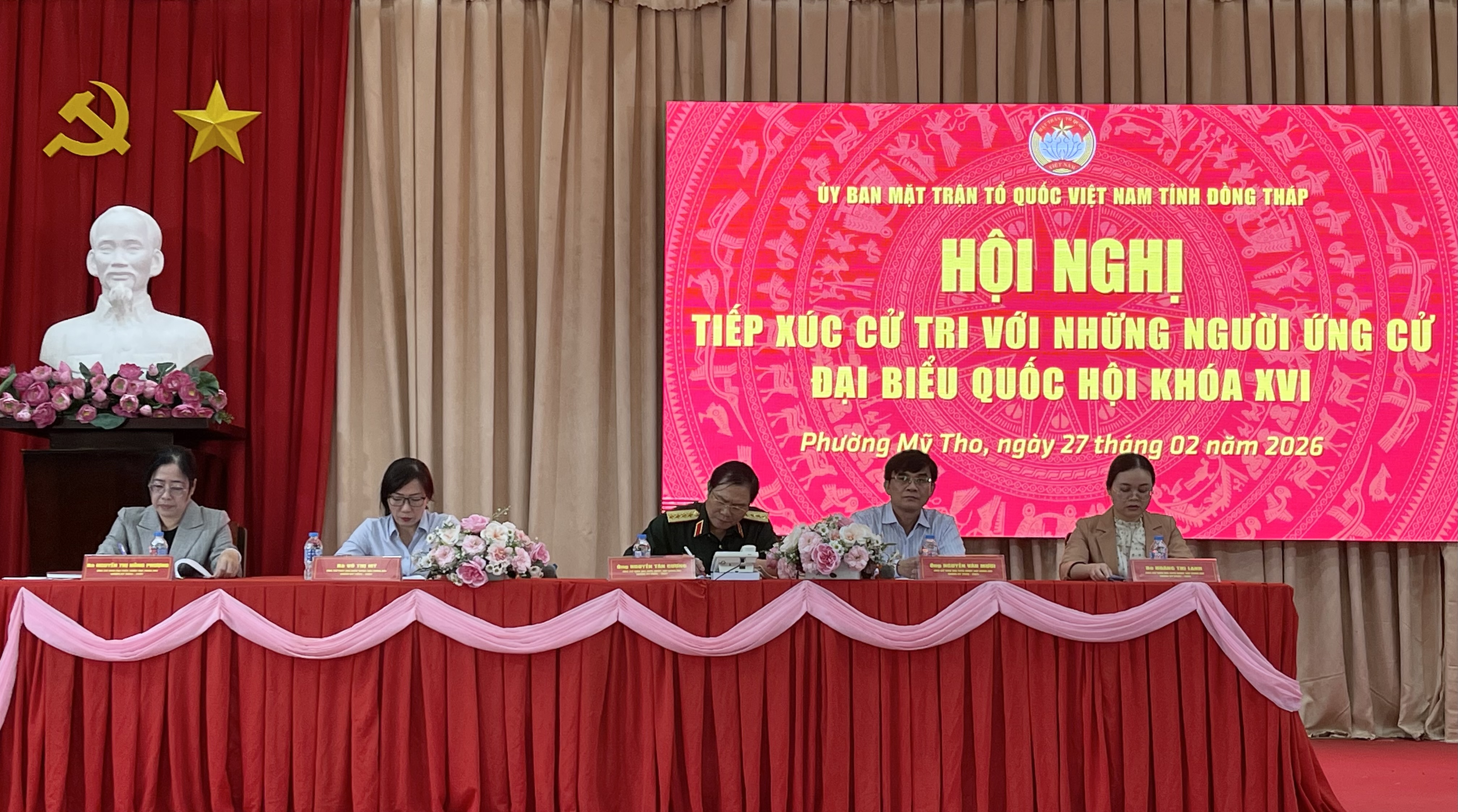Sáng ngày 27/02/2026, Ủy ban Mặt trận Tổ quốc Việt Nam tỉnh Đồng Tháp phối hợp với Ủy ban Mặt trận Tổ quốc Việt Nam phường Mỹ Tho tổ chức Hội nghị tiếp xúc cử tri cho các ứng cử viên đại biểu Quốc hội khóa XVI (đơn vị bầu cử số 5). Tham dự buổi tiếp xúc có trên 400 cử tri của các phường: Mỹ Tho, Đạo Thạnh và Mỹ Phong.