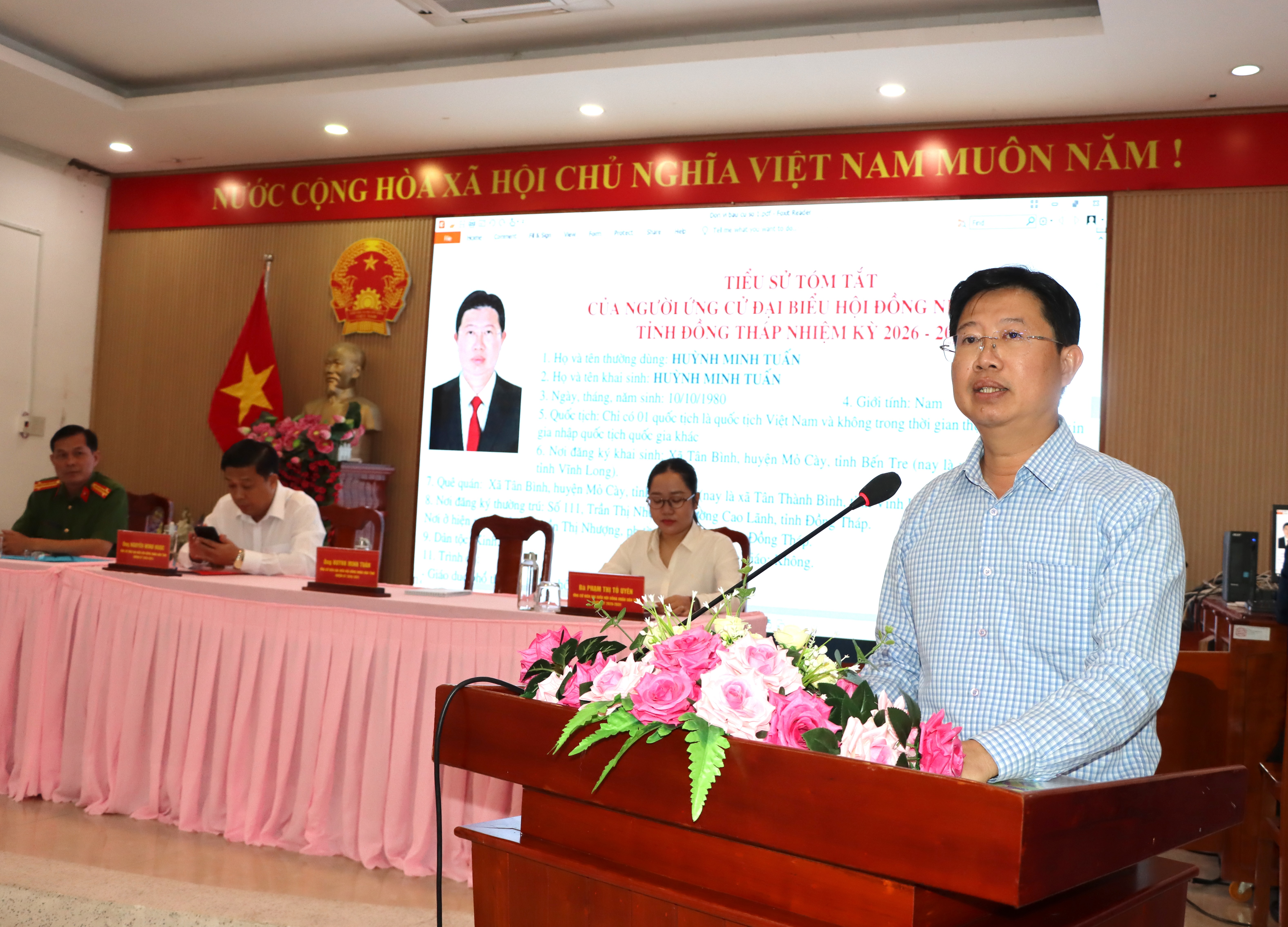 Các ứng cử viên đơn vị bầu cử số 1 gồm: Ông Lý Văn Dũng – Trưởng Công an xã Tân Hộ Cơ; ông Nguyễn Minh Ngọc – Tỉnh uỷ viên, Bí thư Đảng uỷ, Chủ tịch Hội đồng nhân dân xã Tân Hồng; ông Huỳnh Minh Tuấn - Tỉnh uỷ viên, Phó Chủ tịch Uỷ ban nhân dân tỉnh; bà Phạm Thị Tố Uyên – Chuyên viên Trung tâm Phục vụ Hành chính công, Uỷ ban nhân dân xã An Phước và bà Hồng Thị Tứ - Công chức Văn phòng Hội đồng nhân dân và Uỷ ban nhân dân xã Tân Thành.