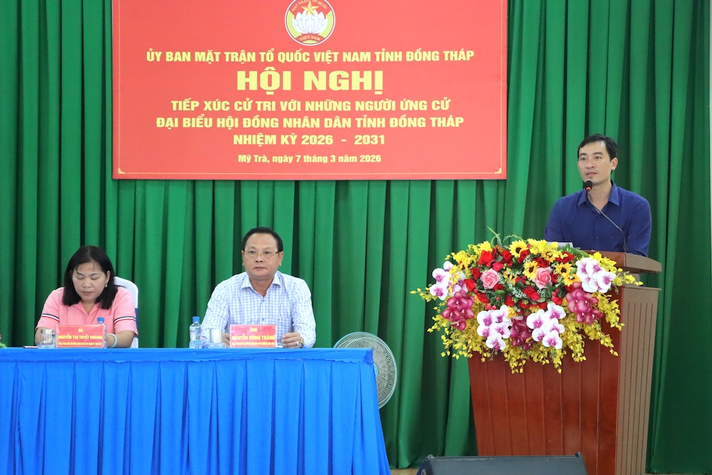 Tiếp tục chương trình vận động bầu cử, chiều ngày 07/3, 05 ứng cử viên đại biểu Hội đồng nhân dân tỉnh Đồng Tháp nhiệm kỳ 2026 – 2031 (đơn vị bầu cử số 7) có buổi tiếp xúc với cử tri khóm 1, 2, 3 và khóm Mỹ Thuận (phường Mỹ Trà). Tham dự có lãnh đạo Uỷ ban Mặt trận Tổ quốc Việt Nam tỉnh; lãnh đạo Đảng uỷ, Uỷ ban nhân dân phường Mỹ Trà.