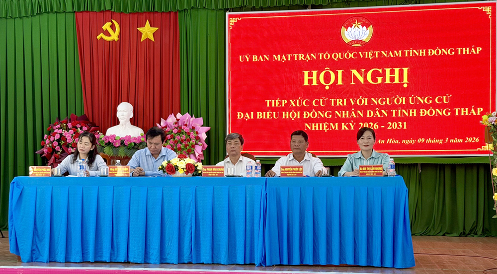 Sáng ngày 09/3, Các ứng cử viên đại biểu Hội đồng nhân dân tỉnh Đồng Tháp nhiệm kỳ 2026 – 2031, đơn vị bầu cử số 03 gồm: ông Phạm Văn Chuẩn - Ủy viên Ban Thường vụ Tỉnh ủy, Phó Chủ tịch Thường trực Hội đồng nhân dân tỉnh; ông Nguyễn Phước Lộc - Phó Chủ tịch Hội sinh vật cảnh tỉnh; ông Lê Hà Luân - Tỉnh ủy viên, Giám đốc Sở Nông nghiệp và Môi trường; bà Nguyễn Phúc Nhi - Phó Chủ tịch Hội đồng nhân dân phường An Bình; bà Bùi Thị Cẩm Nhung – Chánh Văn phòng Đảng ủy xã An Hòa đến tiếp xúc cử tri xã An Hòa để vận động bầu cử.