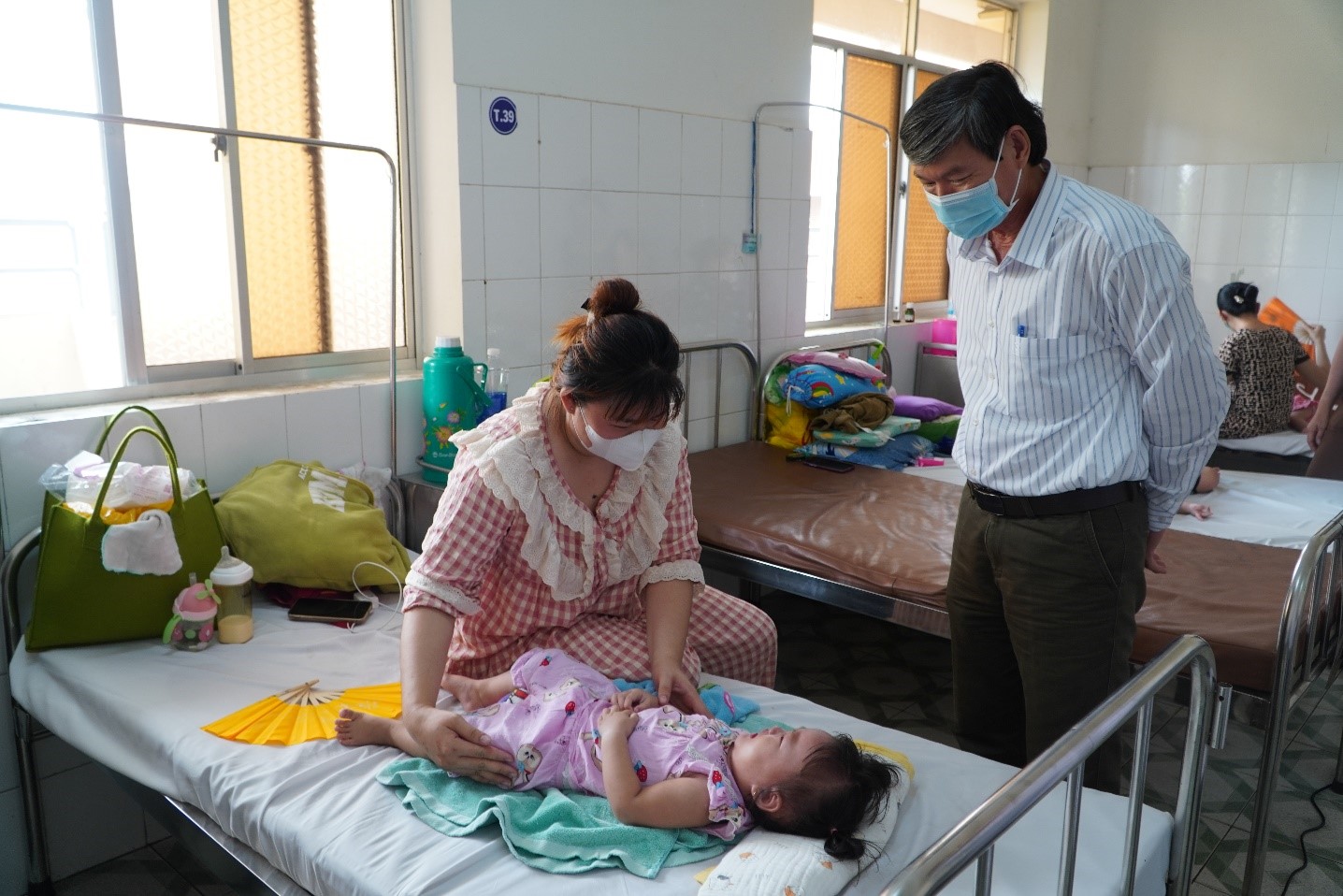 BS.CK2. Phan Văn Ê, Phó Giám đốc Sở Y tế thăm trẻ đang điều trị sởi tại Bệnh viện Đa khoa Sa Đéc.