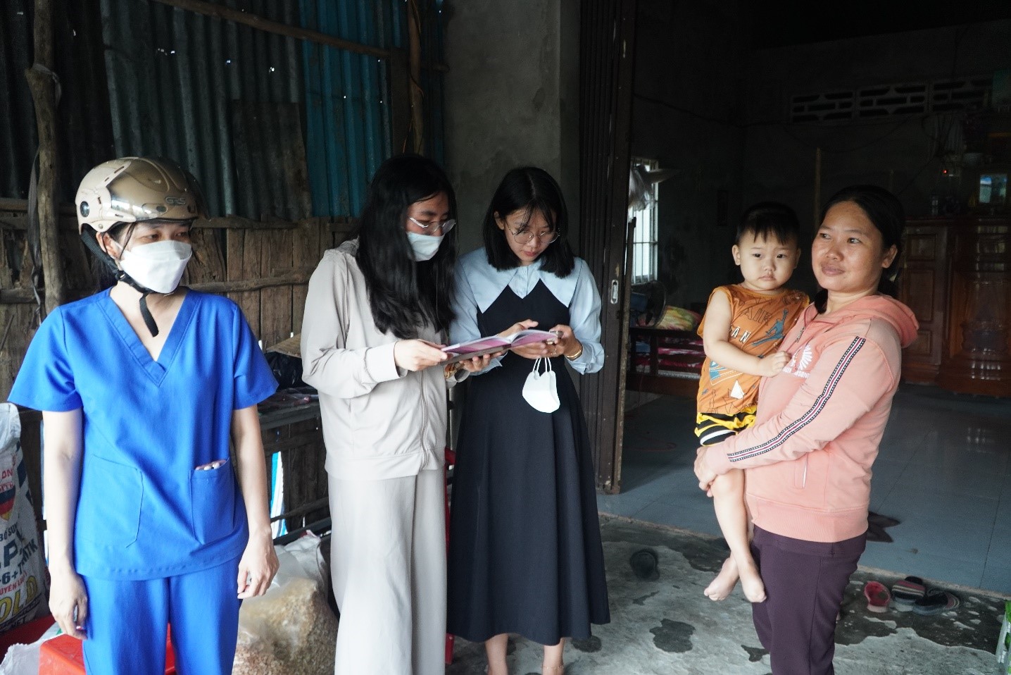 Đoàn giám sát đi cộng đồng tại xã Hưng Thạnh kiểm tra trẻ tiêm ngừa vắc xin sởi.