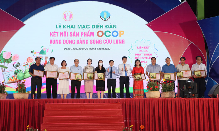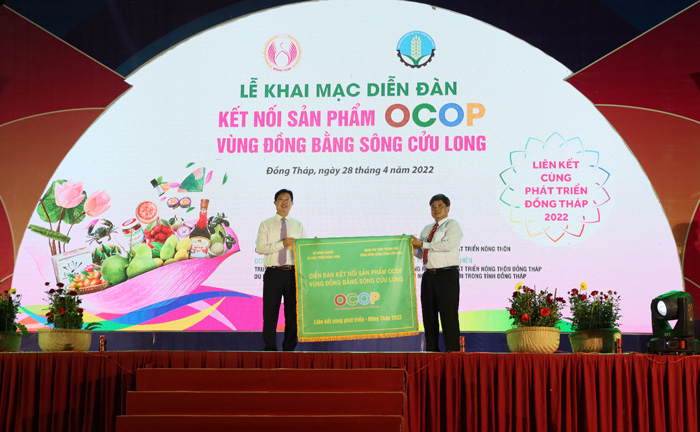 Diễn đàn kết nối sản phẩm OCOP vùng Đồng bằng sông Cửu Long “Liên kết cùng phát triển - Đồng Tháp 2022” khai mạc vào tối 28/4, tại Trung tâm Huấn luyện và Thi đấu Thể dục Thể thao tỉnh Đồng Tháp. Đến dự có Thứ trưởng Bộ Nông nghiệp và Phát triển nông thôn Trần Thanh Nam, đại diện Cục Xúc tiến thương mại (Bộ Công Thương) và lãnh đạo một số tỉnh, thành phố.