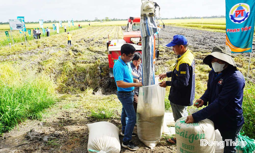 Thu hoạch lúa trên cánh đồng áp dụng mô hình “Canh tác lúa chất lượng cao và phát thải thấp”