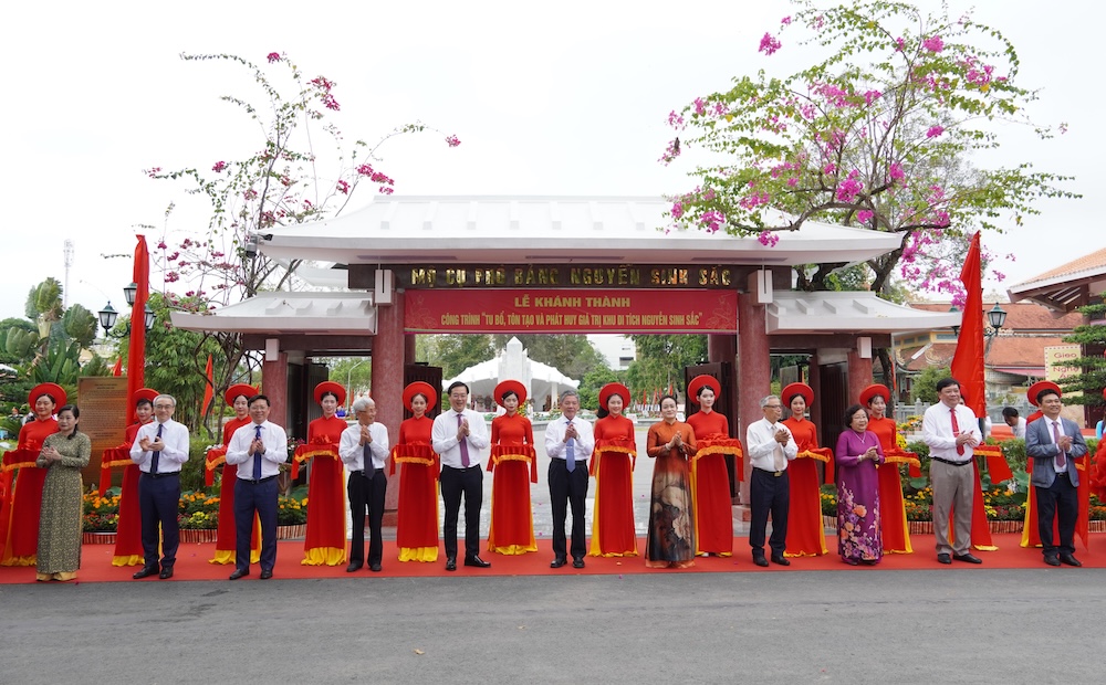 Lãnh đạo Trung ương, lãnh đạo tỉnh Đồng Tháp và đại diện dòng họ Nguyễn Sinh cắt băng khánh thành công trình “Tu bổ, tôn tạo và phát huy giá trị Khu di tích Nguyễn Sinh Sắc”. Ảnh: Việt Tiến