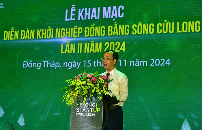 Phát biểu khai mạc Diễn đàn, Phó Chủ tịch Uỷ ban nhân dân tỉnh Trần Trí Quang cho biết, để tiếp tục thúc đẩy và đóng góp thiết thực cho các mục tiêu phát triển kinh tế vùng Đồng bằng sông Cửu Long nói chung và tỉnh Đồng Tháp nói riêng theo định hướng kinh tế xanh, Ủy ban nhân dân tỉnh Đồng Tháp tiếp tục đồng chủ trì với Bộ Nông nghiệp và Phát triển nông thôn, cùng sự cố vấn chuyên môn của Ban Nghiên cứu Phát triển kinh tế tư nhân (Ban IV) và sự phối hợp của Báo Điện tử VnExpress tổ chức Diễn đàn Khởi nghiệp Đồng bằng sông Cửu Long - Lần II năm 2024, với chủ đề “Kinh tế xanh - Động lực mới cho phát triển”.