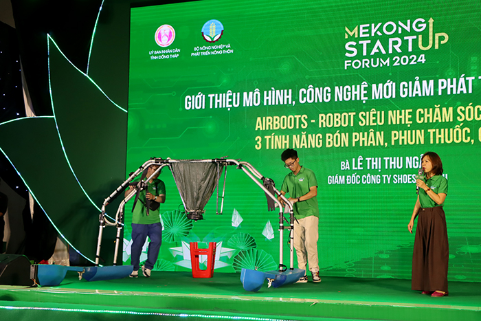 Tại đây, nhiều sản phẩm công nghệ ứng dụng trong sản xuất nông nghiệp được các đơn vị, tổ chức giới thiệu, biểu diễn sinh động. Chẳng hạn, đại diện Công ty Shoes Agtech giới thiệu công nghệ Airboots – Robot siêu nhẹ chăm sóc lúa, với 03 tính năng bón phân, phun thuốc, gieo hạt; Công ty Cổ phần Rynan Technologies Việt Nam giới thiệu nền tảng hệ sinh thái nông nghiệp số và các dữ liệu về phát thải khí nhà kính; Công ty Cổ phần Công nghệ Thực phẩm Sáng tạo giới thiệu mô hình Sản xuất thịt thực vật từ mít – hướng đi bền vững cho nông nghiệp địa phương.