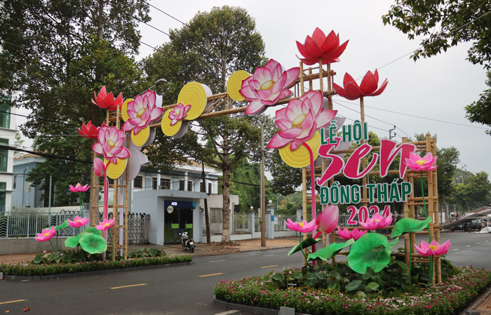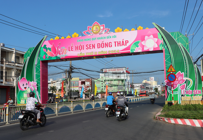 Cổng chào - cửa ngỏ vào thành phố Cao Lãnh trên tuyến Quốc lộ 30, tỉnh Đồng Tháp, chào đón du khách đến với Lễ hội Sen
