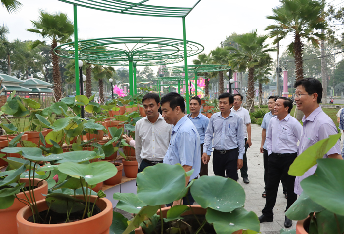Chủ tịch Ủy ban nhân dân tỉnh Phạm Thiện Nghĩa, Phó Chủ tịch Ủy ban nhân dân tỉnh Huỳnh Minh Tuấn và lãnh đạo các sở, ngành tỉnh, Ủy ban nhân dân thành phố Cao Lãnh đến khảo sát không gian trưng bày các giống Sen