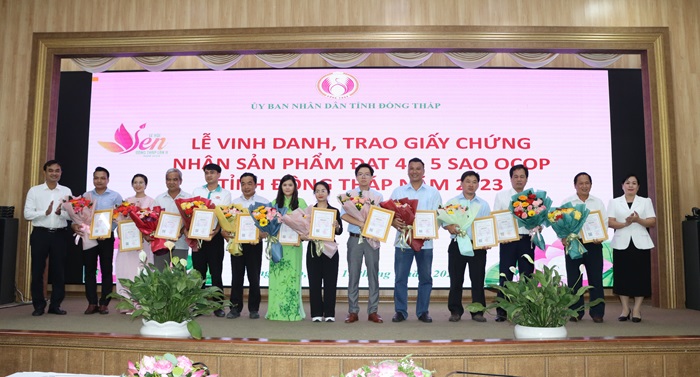 Tại hội thảo, Ban tổ chức công bố Quyết định của Ủy ban nhân dân tỉnh về công nhận kết quả đánh giá, phân hạng sản phẩm đạt 4 sao OCOP tỉnh Đồng Tháp năm 2023 (40 sản phẩm) và trao giấy chứng nhận cho các chủ thể OCOP là doanh nghiệp, hợp tác xã và hộ kinh doanh.