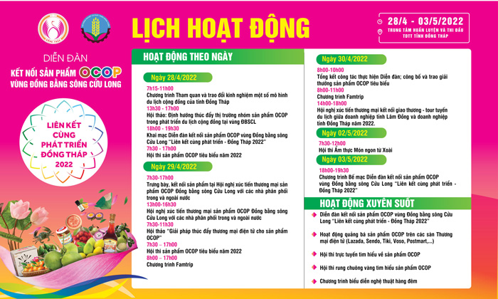 Đối với Diễn đàn Kết nối sản phẩm OCOP vùng Đồng bằng sông Cửu Long “Liên kết cùng phát triển – Đồng Tháp 2022”, sẽ diễn ra từ ngày 28/4 đến ngày 03/5. Lễ khai mạc bắt đầu lúc 18 giờ ngày 28/4, tại Trung tâm Huấn luyện và Thi đấu Thể dục Thể thao tỉnh. Đến nay có 32 tỉnh, thành phố đăng ký tham dự và có 320 gian hàng.