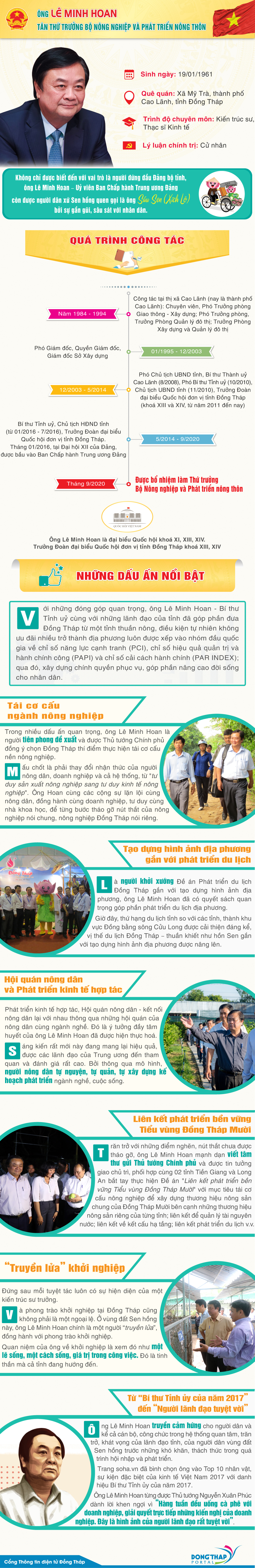 Theo Cổng Thông tin điện tử Chính phủ, Thủ tướng Chính phủ đã có Quyết định số 1433/QĐ-TTg điều động, bổ nhiệm ông Lê Minh Hoan - Uỷ viên Trung ương Đảng, Bí thư Tỉnh uỷ, Trưởng Đoàn đại biểu Quốc hội khóa XIV tỉnh Đồng Tháp giữ chức Thứ trưởng Bộ Nông nghiệp và Phát triển nông thôn. Mời xem Infographic Chân dung tân Thứ trưởng Bộ Nông nghiệp và Phát triển nông thôn Lê Minh Hoan.