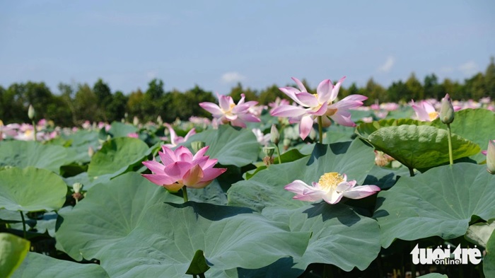Cánh đồng sen xã Láng Biển, huyện Tháp Mười bung nở rực rỡ dọc tuyến đường ĐT 850