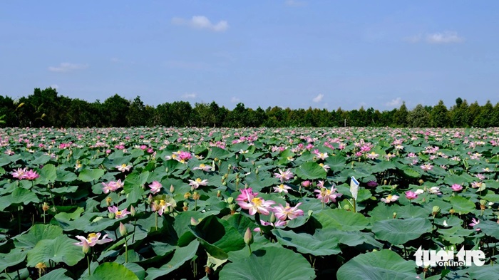 Giữa tháng 4, những đồng sen ở Đồng Tháp đã bắt đầu nở rực rỡ cả cánh đồng. Nhiều người dừng xe chụp ảnh rồi tìm bóng râm thưởng thức hương thơm.