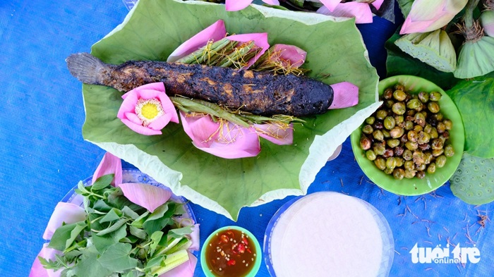 Về đồng sen nhất định phải thử món cá lóc nướng trui cuốn lá sen non, gỏi ngó sen, cơm hạt sen và thưởng thức thêm các món ăn đồng quê.