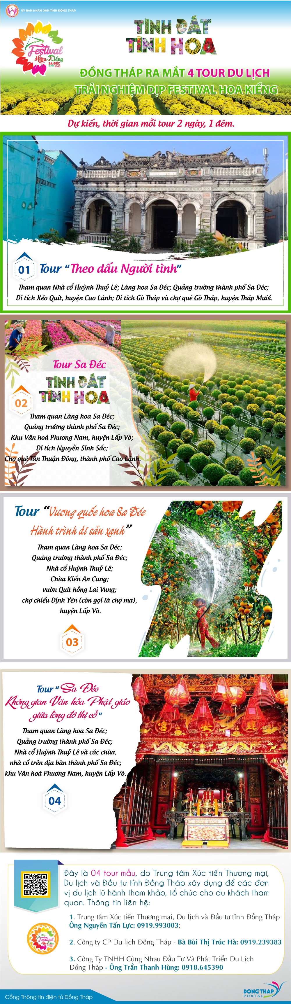 Trong khuôn khổ chương trình Festival Hoa – Kiểng Sa Đéc lần thứ I năm 2023, từ ngày 30/12/2023 đến ngày 05/01/2024, Đồng Tháp ra mắt 04 tour du lịch trải nghiệm để du khách có thể thưởng thức trọn vẹn cảnh quan thiên nhiên, công trình kiến trúc, văn hóa lịch sử, đời sống sinh hoạt của người dân tại xứ sở Đất Sen hồng. Mời quý độc giả xem qua Infographic dưới đây: