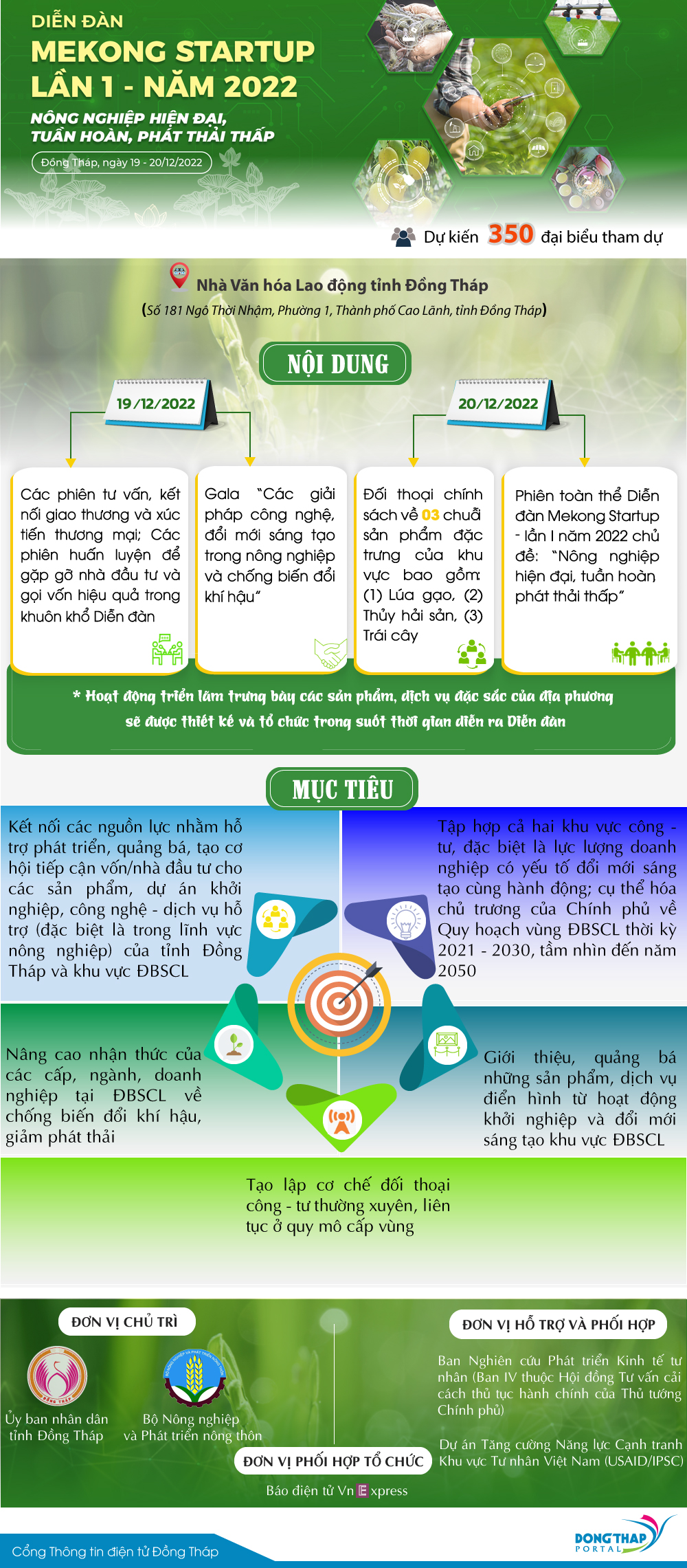 Từ ngày 19 – 20/12, tỉnh Đồng Tháp đăng cai tổ chức Diễn đàn Khởi nghiệp cấp vùng - Mekong Startup lần I năm 2022 với chủ đề “Nông nghiệp hiện đại, tuần hoàn, phát thải thấp”. Đây là lần đầu tiên, Đồng Tháp tổ chức diễn đàn về khởi nghiệp với quy mô lớn, có ý nghĩa quan trọng nhằm góp phần giải quyết bài toán về chuyển đổi nông nghiệp xanh - hiện đại - bền vững để tạo bứt phá cho kinh tế vùng. Mời xem Infographic dưới đây.