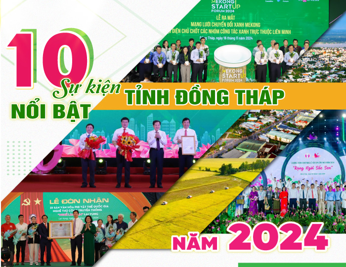 Năm 2024, trong bối cảnh còn nhiều khó khăn, biến động nhưng với sự đoàn kết, đồng lòng của cả hệ thống chính trị, nỗ lực khắc phục khó khăn, vượt qua thách thức của cộng đồng doanh nghiệp và nhân dân, tỉnh Đồng Tháp đã đạt nhiều kết quả nổi bật trên tất cả các lĩnh vực, tạo thế và lực mới đưa tỉnh Đồng Tháp ngày một phát triển, vươn xa. Cổng Thông tin điện tử Đồng Tháp trân trọng giới thiệu 10 sự kiện nổi bật của tỉnh trong năm 2024.