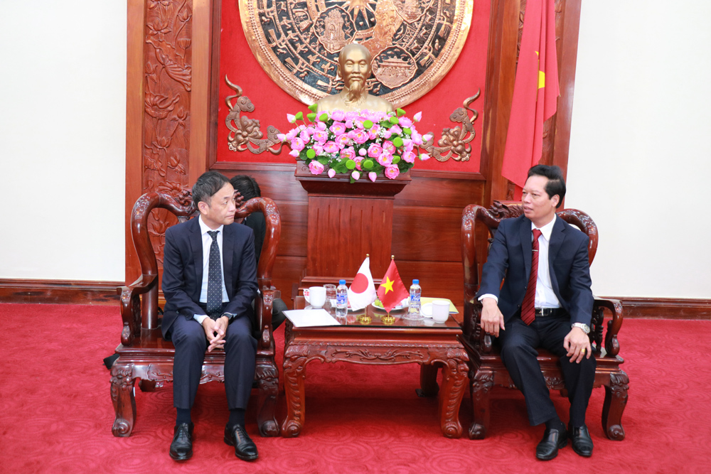 Vice Chairman of the Provincial People's Committee Nguyen Thanh Dieu (right) discusses the province's potential and strengths with Mr. Okabe Mitsutoshi