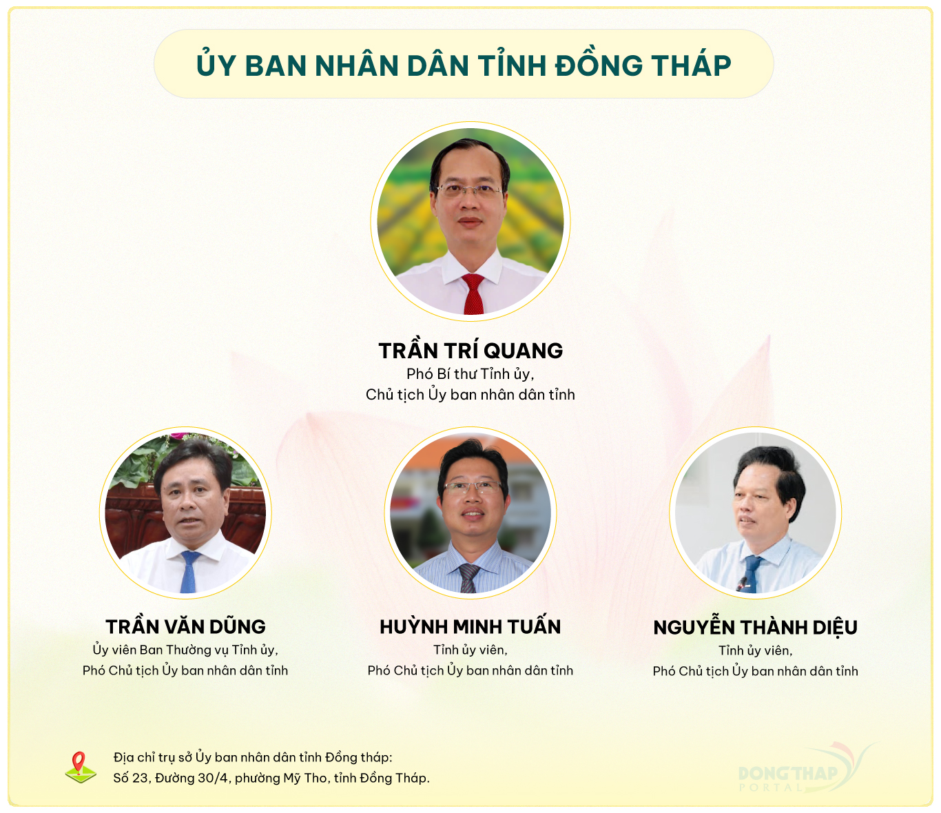 Ngày 02/7, Ủy ban nhân dân tỉnh Đồng Tháp tổ chức Hội nghị công bố các Nghị quyết của Hội đồng nhân dân tỉnh và triển khai các Quyết định về tổ chức bộ máy, công tác cán bộ. Tại hội nghị đã công bố Nghị quyết của Hội đồng nhân dân tỉnh về thành lập các cơ quan chuyên môn thuộc Ủy ban nhân dân tỉnh; đồng thời, công bố, triển khai các Quyết định của Chủ tịch Ủy ban nhân dân tỉnh về bổ nhiệm các Giám đốc, các Phó Giám đốc các Sở, ngành tỉnh thành lập mới.