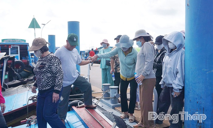 Du khách xuống tàu du lịch để di chuyển sang cù lao Thới Sơn