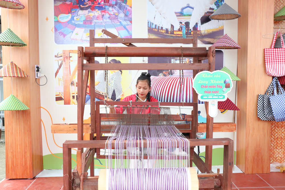 Không gian Lễ hội còn kết nối với các làng nghề truyền thống khác trên địa bàn tỉnh Đồng Tháp. Người dân trải nghiệm dệt khăn choàng - Làng nghề dệt choàng Long Khánh trăm năm tuổi