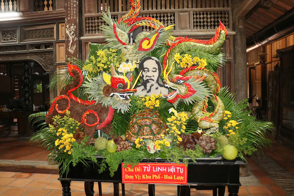 Một tác phẩm trong Hội thi chưng nghi, với chủ đề “Tứ linh hội tụ” được sắp đặt từ đôi bàn tay khéo léo của các nghệ nhân