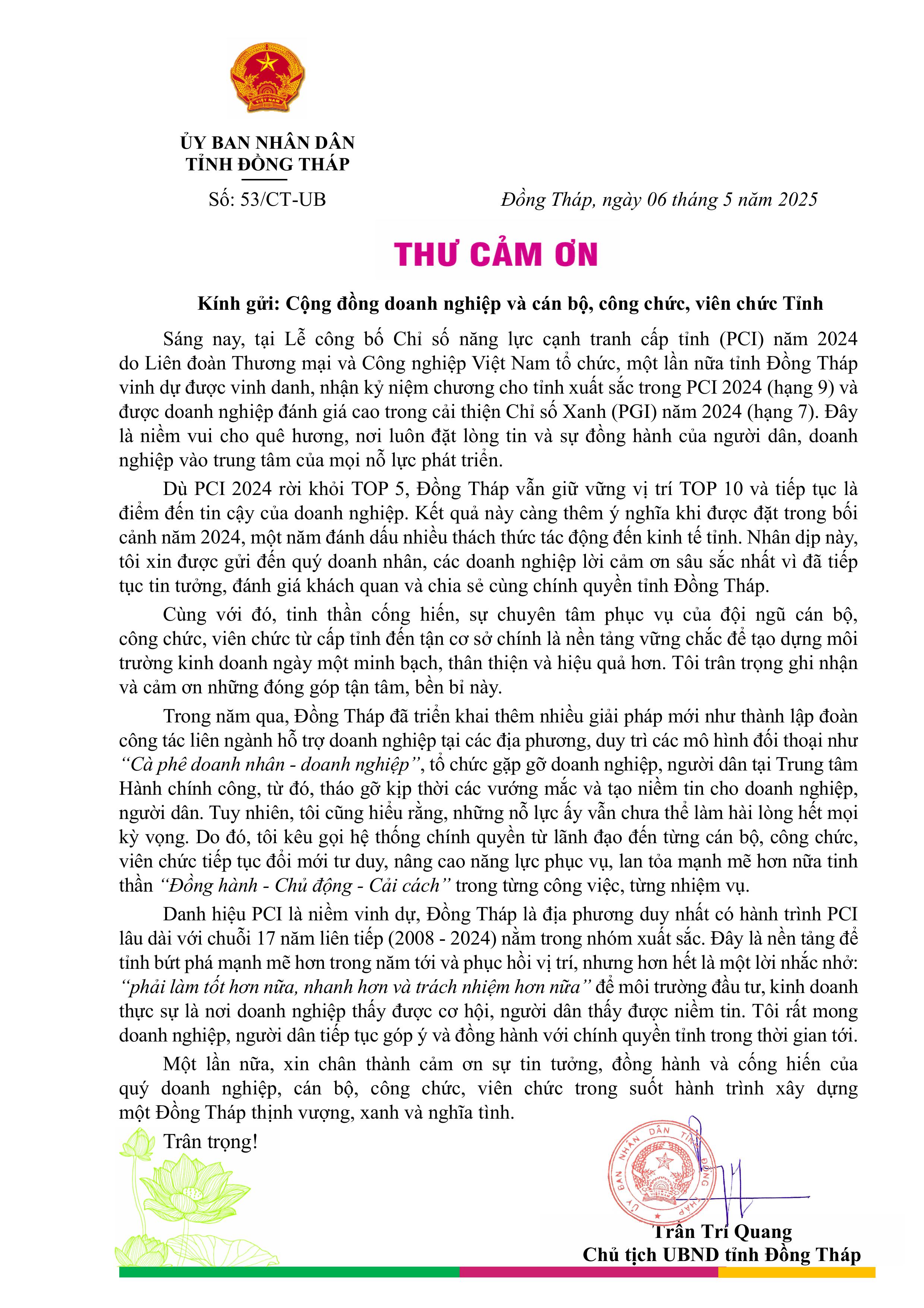 Đồng Tháp là tỉnh 17 năm liên tục có chất lượng điều hành kinh tế xuất sắc, thuộc top 10 tỉnh, thành phố có điểm Chỉ số Năng lực cạnh tranh cấp tỉnh (PCI) năm 2024 hàng đầu Việt Nam. Sau lễ công bố PCI vào sáng ngày 06/5, người đứng đầu Ủy ban nhân dân tỉnh có Thư cảm ơn cộng đồng doanh nghiệp và cán bộ, công chức, viên chức tỉnh nhà.