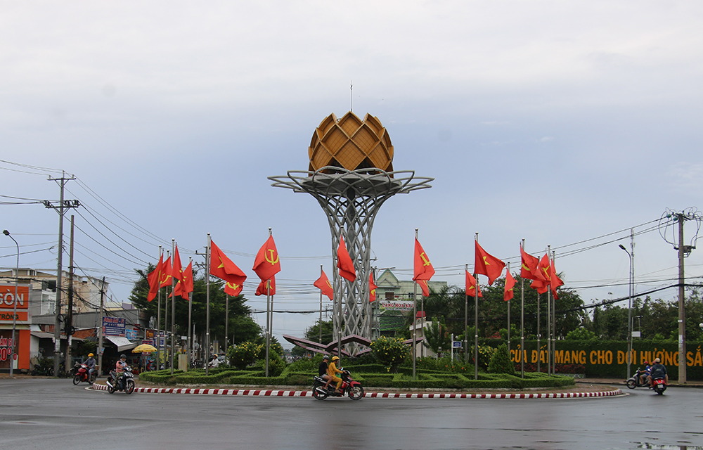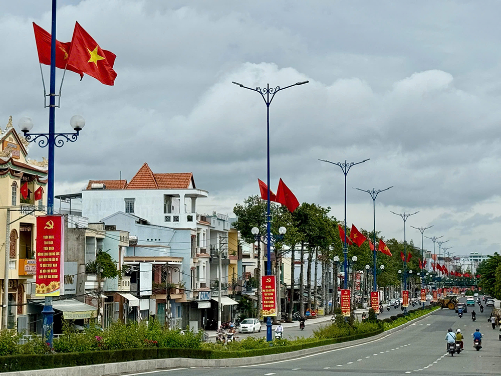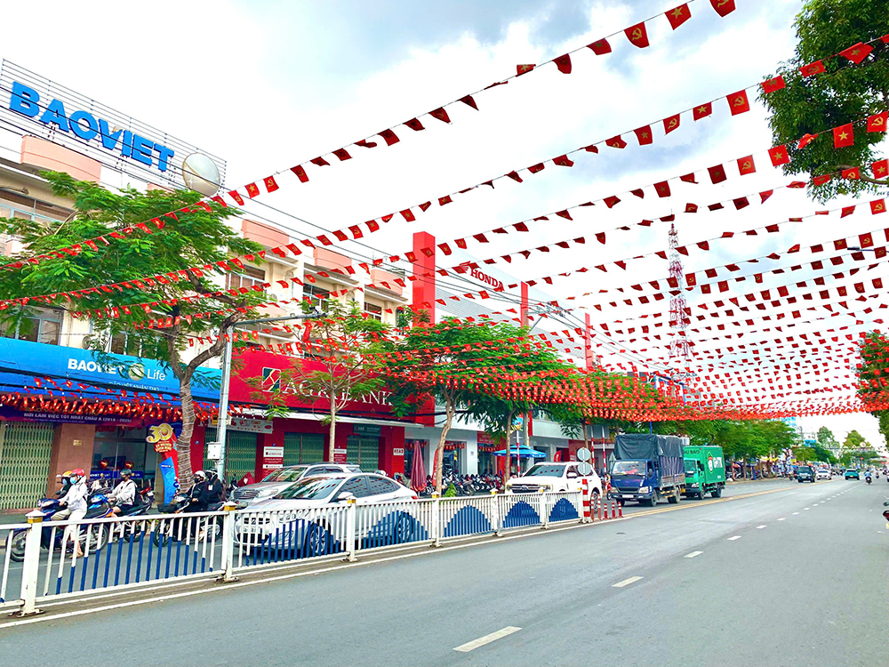 Đường Nguyễn Huệ, phường Cao Lãnh rực rỡ màu cờ chào mừng Đại hội. Ảnh: Dương Út