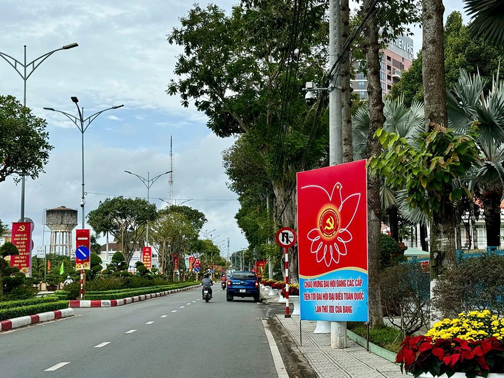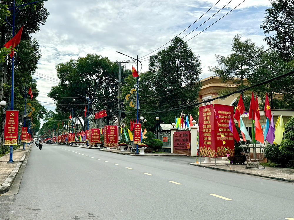Tuyến đường Hùng Vương (phường Mỹ Tho) rực rỡ cờ hoa, khẩu hiệu trang trí chào mừng Đại hội