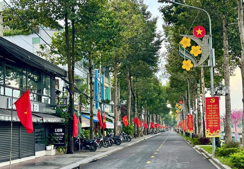 Các tuyến đường Rạch Gầm, 30/4, Yersin treo cờ Tổ quốc, cờ Đảng chào mừng Đại hội